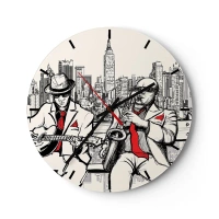 Relógio de parede - Relógio em vidro - Um mostrador de relógio com um motivo de músicos de jazz tendo como pano de fundo a cidade de Nova York - 30x30cm - Improvisação nova-iorquina