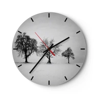 Relógio de parede - Relógio em vidro - Três árvores solitárias em um campo nevado em preto e branco. - 30x30cm - Com que sonham elas? - Decoração de parede moderna para a sala de estar, cozinha e quarto ARTTOR