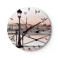 Relógio de parede - Relógio em vidro - Uma lanterna, pombos e o panorama de Paris ao pôr do sol - 30x30cm - Sobre os telhados de Paris - Decoração de parede moderna para a sala de estar, cozinha e quarto ARTTOR