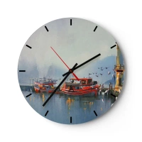 Relógio de parede - Relógio em vidro - Um porto com barcos vermelhos em águas calmas pela manhã - 30x30cm - No fim do mundo - Decoração de parede moderna para a sala de estar, cozinha e quarto ARTTOR