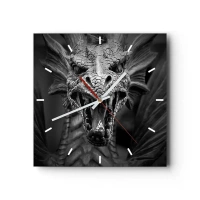 Relógio de parede - Relógio em vidro - Dragão de conto de fadas em tons de cinza - 30x30 cm