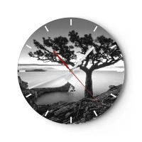 Relógio de parede - Relógio em vidro - Uma árvore em um penhasco com vista para o mar em preto e branco - 30x30cm - Paz até ao horizonte - Decoração de parede moderna para a sala de estar, cozinha e quarto ARTTOR