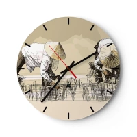 Relógio de parede - Relógio em vidro - Um motivo de desenho animado de fazendeiros trabalhando em um campo de arroz em tons de bege. - 30x30cm - Boa colheita - Decoração de parede moderna para a sala de estar, cozinha e quarto ARTTOR