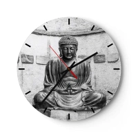 Relógio de parede - Relógio em vidro - Uma estátua de Buda em estilo monocromático contra um fundo de parede - 30x30cm - Na fonte da paz - Decoração de parede moderna para a sala de estar, cozinha e quarto ARTTOR