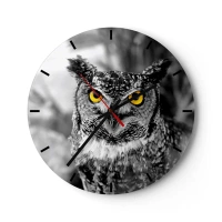 Relógio de parede - Relógio em vidro - Uma coruja com olhos amarelos em um fundo preto e branco - 30x30cm - Nada pode ser escondido - Decoração de parede moderna para a sala de estar, cozinha e quarto ARTTOR