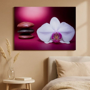 Quadro em tela - Orquídea branca e pedras em fundo rosa - 70x50cm - O estudo do frescor em roxo - Decoração de parede moderna para a sala de estar e quarto ARTTOR