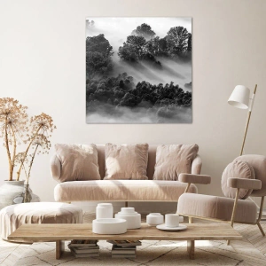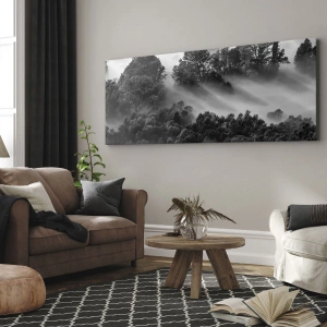 - Esta tela de 70x50 cm retrata uma paisagem florestal em preto e branco sob a névoa da manhã. Uma decoração única que traz uma sensação de tranquilidade e elegância a qualquer interior.