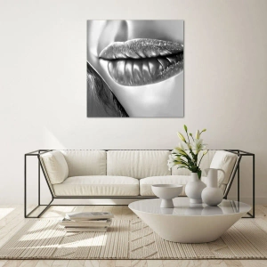 Quadro em vidro - Lábios femininos sensuais em tons monocromáticos - 70x50cm - Eu sei o que está a pensar... - Decoração de parede moderna para a sala de estar e quarto ARTTOR