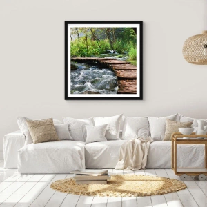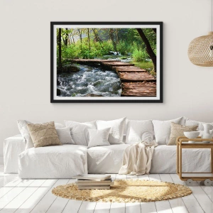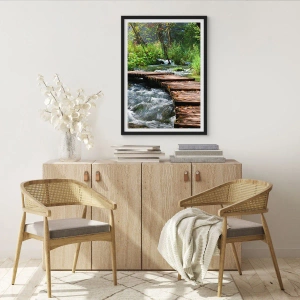 Pôster com moldura preta - Uma ponte de madeira sobre um riacho caudaloso - 50x70cm - Sobre a cascata espumosa - Decoração de parede moderna para a sala de estar e quarto ARTTOR