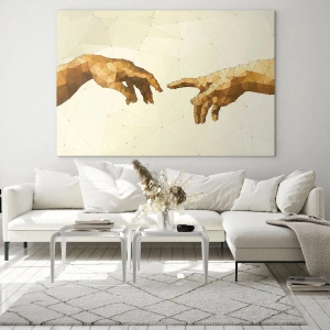 - Esta impressão em vidro de 70x50 cm retrata uma versão estilizada da pintura poligonal "A Criação de Adão". Perfeita para interiores modernos e criativos.