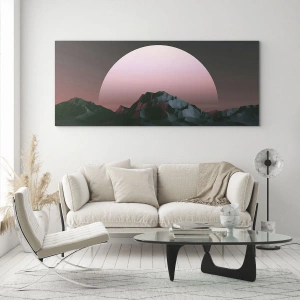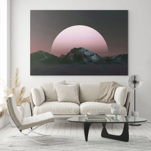 Quadro em vidro - Paisagem abstrata com montanhas geométricas e um sol rosa. - 70x50cm - Numa galáxia vizinha - Decoração de parede moderna para a sala de estar e quarto ARTTOR