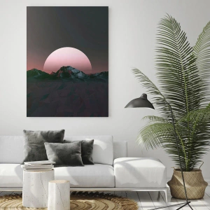 - A pintura retrata uma paisagem abstrata com montanhas geométricas e um sol rosa pastel sobre um fundo escuro. É uma escolha perfeita para interiores modernos.