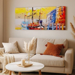 Quadro em tela - Porto pitoresco ao pôr do sol com barcos de pesca - 70x50cm - Feliz retorno - Decoração de parede moderna para a sala de estar e quarto ARTTOR
