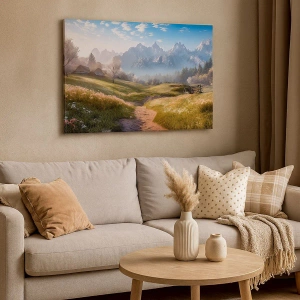 - Uma pintura representando um vale montanhoso com prados, cabanas e uma vista dos picos das montanhas, perfeita para interiores inspirados na natureza e em estilo rústico.