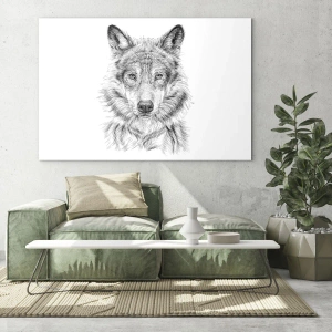 Quadro em vidro - Esboço em preto e branco de uma cabeça de lobo em um fundo branco - 70x50cm - Um líder nato - Decoração de parede moderna para a sala de estar e quarto ARTTOR