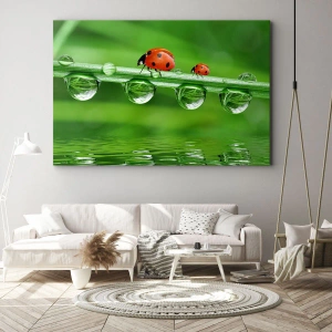 • A pintura retrata duas joaninhas em uma folha de grama cercada por gotas de orvalho. Uma composição harmoniosa inspirada na natureza, perfeita para interiores que convidam ao relaxamento.