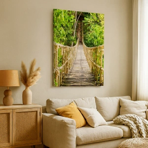 - Esta impressão em tela retrata uma ponte suspensa em uma floresta tropical, cercada por uma vegetação exuberante. Um complemento perfeito para interiores inspirados na natureza e no exótico, trazendo harmonia e tranquilidade.
