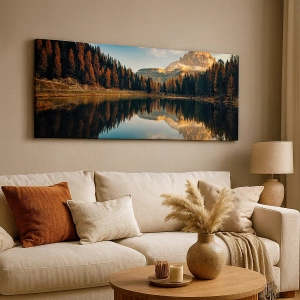 O reflexo das árvores e do céu no lago torna a pintura atraente, criando uma impressão de profundidade. As cores do outono adicionam calor e beleza natural, perfeitamente adequadas a interiores modernos e clássicos. As montanhas ao fundo simbolizam a força e a majestade da natureza, enquanto o céu enfatiza o espaço.