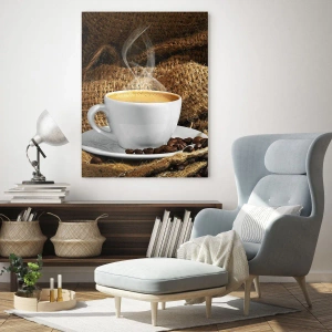 Quadro em vidro - Uma xícara de café com grãos em um fundo de juta - 70x50cm - O cheiro de moka e a densidade do líquido de mel - Decoração de parede moderna para a sala de estar e quarto ARTTOR