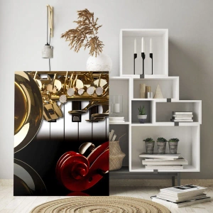 Quadro em vidro - Saxofone, teclado e arco em uma composição artística - 70x50cm - Metal, madeira e marfim - Decoração de parede moderna para a sala de estar e quarto ARTTOR