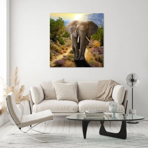 A composição "Elefante em uma paisagem montanhosa ao pôr do sol" é perfeita para salas de estar, escritórios e quartos, criando uma atmosfera de harmonia e proximidade com a natureza. Graças ao seu design exclusivo, também é adequada para espaços como hotéis e restaurantes, enfatizando seu caráter único.