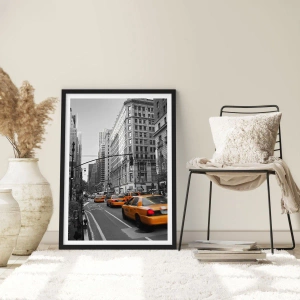 Pôster com moldura preta - Táxis amarelos nas ruas da cidade em preto e branco - 50x70cm - Sol da cidade grande - Decoração de parede moderna para a sala de estar e quarto ARTTOR