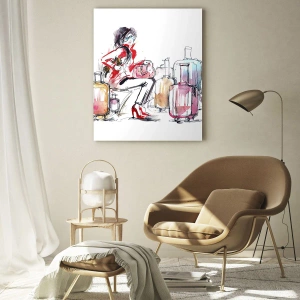 Quadro em vidro - Uma mulher de casaco vermelho cercada por malas em um estilo esboçado. - 70x50cm - Vamos sentar antes da viagem - Decoração de parede moderna para a sala de estar e quarto ARTTOR