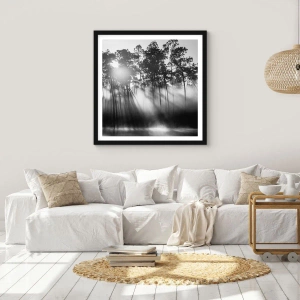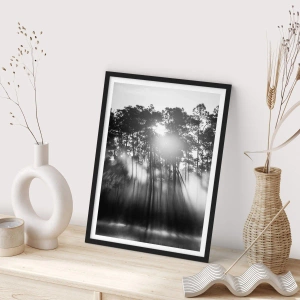 - Este pôster retrata uma cena de floresta em preto e branco com raios de sol brilhando através da neblina. Uma decoração melancólica que adiciona elegância e tranquilidade a qualquer interior.