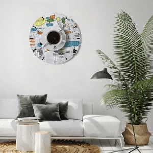 O relógio de parede "Hora de uma Pausa" é a escolha perfeita para quem valoriza a inspiração e a criatividade no dia a dia profissional. O mostrador do relógio apresenta uma xícara de café aromático sobre um plano de negócios repleto de gráficos, anotações e desenhos que simbolizam estratégias e ideias. Esta composição captura perfeitamente o espírito do trabalho de escritório e dos processos criativos, ao mesmo tempo que introduz uma atmosfera de motivação e relaxamento.