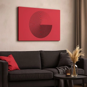 • Uma pintura minimalista que retrata círculos geométricos em forma de linhas concêntricas sobre um fundo vermelho vibrante. Perfeita para interiores modernos, ela introduz harmonia e ritmo visual.