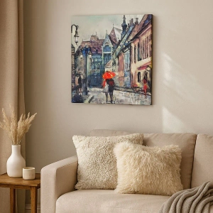 Quadro em tela - Uma charmosa rua da cidade com um casal sob um guarda-chuva vermelho - 70x50cm - Chuva para dois - Decoração de parede moderna para a sala de estar e quarto ARTTOR