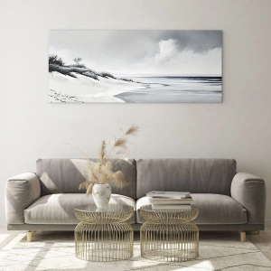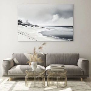 Quadro em vidro - Praia preta e branca com horizonte e mar calmo - 70x50cm - Juntos para sempre - Decoração de parede moderna para a sala de estar e quarto ARTTOR
