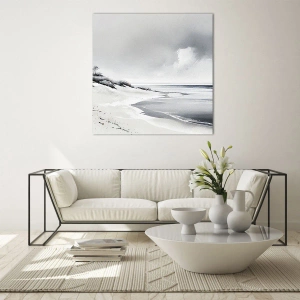 - A pintura retrata uma paisagem litorânea tranquila em preto e branco. A forma minimalista e as cores suaves criam uma atmosfera melancólica e uma sensação de tranquilidade.