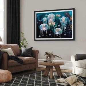 - Este pôster retrata águas-vivas delicadas e luminosas flutuando nas profundezas do mar. Seus corpos transparentes e a luz sutil criam um efeito visual impressionante.