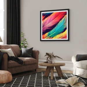 Pôster com moldura preta - Penas coloridas em tons vibrantes sobre fundo escuro - 50x70cm - Arco-íris emplumado - Decoração de parede moderna para a sala de estar e quarto ARTTOR
