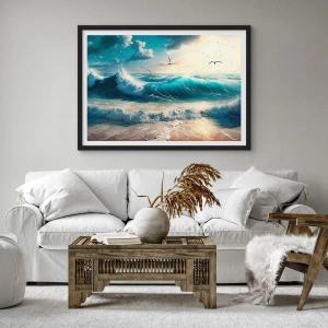- O pôster retrata ondas turquesa quebrando contra uma praia dourada. A composição dinâmica, combinada com a iluminação suave, confere à imagem uma sensação harmoniosa e estival, perfeita para interiores tranquilos.
