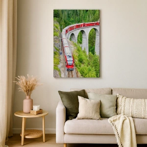 - Uma pintura pitoresca que retrata um trem viajando por um viaduto em uma paisagem montanhosa. Sua harmonia natural e elegância combinam perfeitamente com interiores modernos.