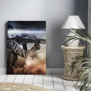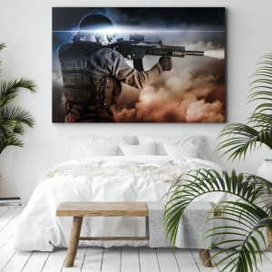 Pintura de parede - Soldado em ação com um rifle - Soldado em ação com um rifle contra um fundo de nuvens e luz