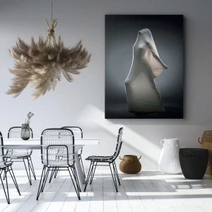 Arte em tela "Figura em tecido branco sobre fundo escuro" é uma obra que combina elegância, sutileza e expressão artística. O motivo central é uma figura delicada, envolta em um tecido leve e semitransparente, que cria um efeito etéreo e misterioso. O contraste entre o brilho do tecido e o fundo escuro enfatiza a beleza do minimalismo e o foco nos detalhes.