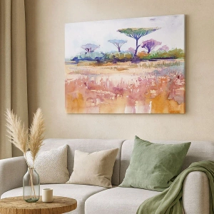 A tela é esticada na moldura. Os lados e bordas são impressos para criar uma continuação da imagem. O quadro está pronto para ser pendurado na parede. Cada produto tem um gancho ligado à moldura e um conjunto de montagem (parafuso + cavilha).