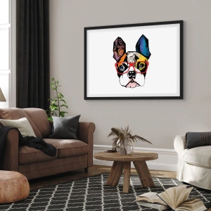 - Este pôster colorido retrata um cachorro usando óculos em estilo pop art. O pôster com moldura preta é uma decoração de parede moderna perfeita, adicionando um caráter único e expressivo a qualquer interior.