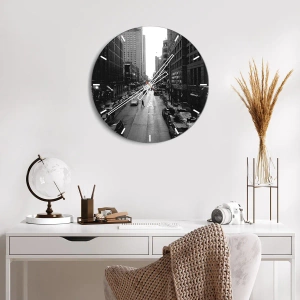O relógio de parede "Urban Accent" é um acessório único que traz a atmosfera da vida urbana para o seu interior. O mostrador do relógio apresenta uma fotografia em preto e branco de uma rua da cidade com prédios e transeuntes. Este motivo minimalista encanta com seus contrastes sutis e design clássico.