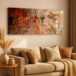 "Amarrada em uma teia de aranha" é uma impressionante impressão em tela que retrata gotas d'água incrustadas nas delicadas fibras de uma planta. A macrofotografia combinada com reflexos de luz e cores quentes cria uma composição incrivelmente artística que atrai o olhar e confere ao interior um caráter único.