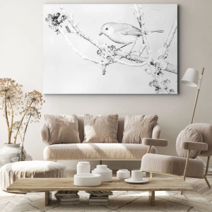 Quadro em tela - Pássaro em um galho em preto e branco com um estilo minimalista - 70x50cm - Manhã de inverno - Decoração de parede moderna para a sala de estar e quarto ARTTOR