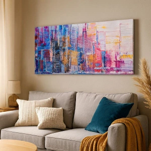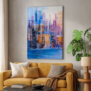 A composição da pintura combina vários tons de azul, roxo, laranja e rosa, que juntos criam um todo harmonioso. A representação abstrata de edifícios e seus reflexos na água enfatiza o estilo contemporâneo da obra, que se adapta perfeitamente a designs de interiores modernos.