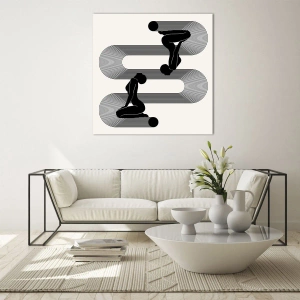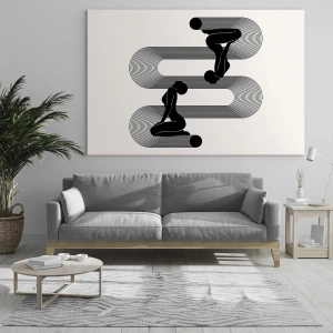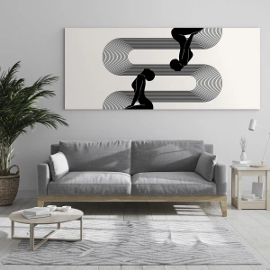 O quadro de vidro "Sensual Symmetry" apresenta silhuetas femininas minimalistas em um espaço abstrato com um motivo de linhas gráficas. A composição combina o contraste do preto e branco com um equilíbrio visual de formas.