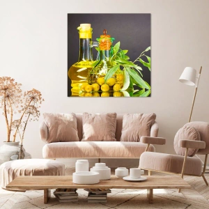 "Natureza Morta com Azeitonas e Azeite" é uma pintura única que retrata uma elegante composição de garrafas de azeite e ramos de oliveira. Este motivo enfatiza o caráter mediterrâneo e faz alusão à natureza e a um estilo de vida saudável. Delicados tons de verde e a transparência do vidro trazem frescor e harmonia a qualquer interior.