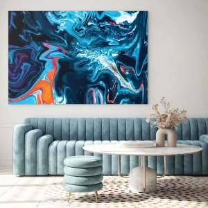 Padrão abstrato em tons de azul com detalhes em vermelho e branco é uma pintura que cativa por sua energia e caráter cósmico. A combinação de formas dinâmicas e cores intensas cria uma composição que atrai a atenção e traz uma atmosfera única ao interior. Esta é uma proposta para os amantes do design moderno e da arte contemporânea que buscam decorações com personalidade.
