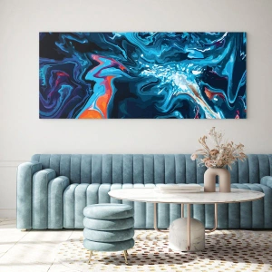 Quadro em vidro - Um padrão abstrato em tons de azul com detalhes em vermelho e branco. - 70x50cm - Viagem ao centro do céu - Decoração de parede moderna para a sala de estar e quarto ARTTOR