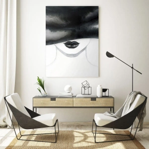 "Mistério Sensual" é uma elegante pintura de 70x50 cm sobre vidro, que retrata o rosto misterioso de uma mulher em aquarela em preto e branco. Linhas sutis e lábios expressivos criam um contraste extraordinário que atrai a atenção e estimula a reflexão.